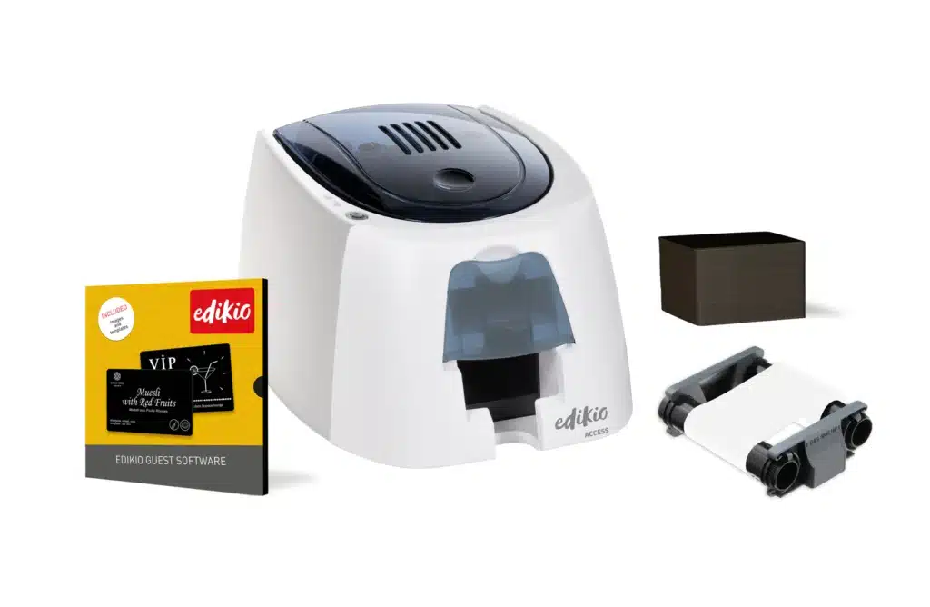 เครื่องพิมพ์บัตรพลาสติก รุ่น Edikio Access รุ่นเริ่มต้นสำหรับงานโรงแรมและงานร้านอาหารตั้งแต่ขนาดเล็ก จนถึงขนาดใหญ่ พิมพ์สสีขาวและสีดำ ตัวเครื่องพิมพ์มาพร้อม Template สำหรับการออกแบบและการลิงค์ชุดข้อมูลต่างๆ เช่นรายชื่อลูกค้าหรือเมนูอาหาร ออกแบบมาให้ใช้งานง่ายและพกพาสะดวก